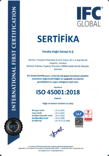 Varaka Kağıt Sanayi A.Ş. olarak;